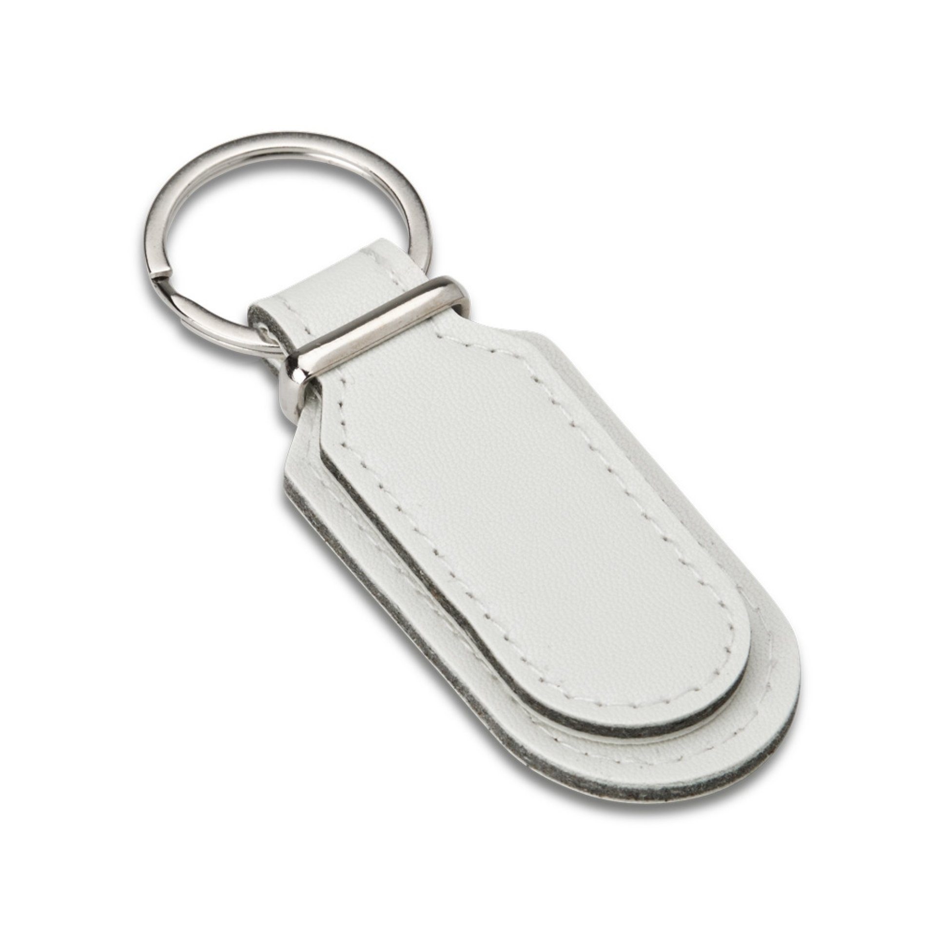 Chaveiro de couro sintético com detalhe em metal e frente e verso lisos.